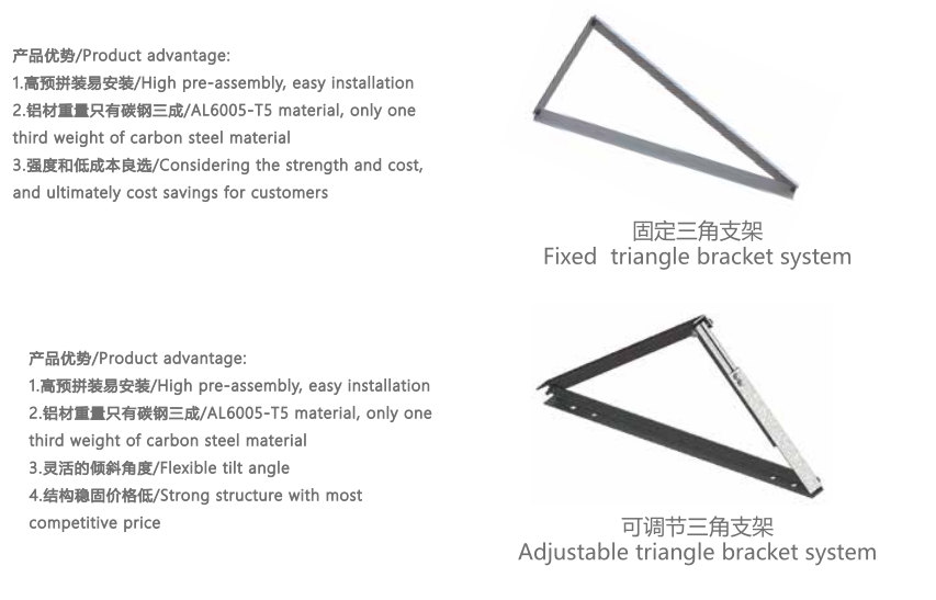The Adjustable Triangle Solar Mounting System is suitable for flat rooftop, easy and quick to install, allowing for adjusting the tilt angle if necessary. Components are pre-assembled in advance to place solar panels together without difficulty.