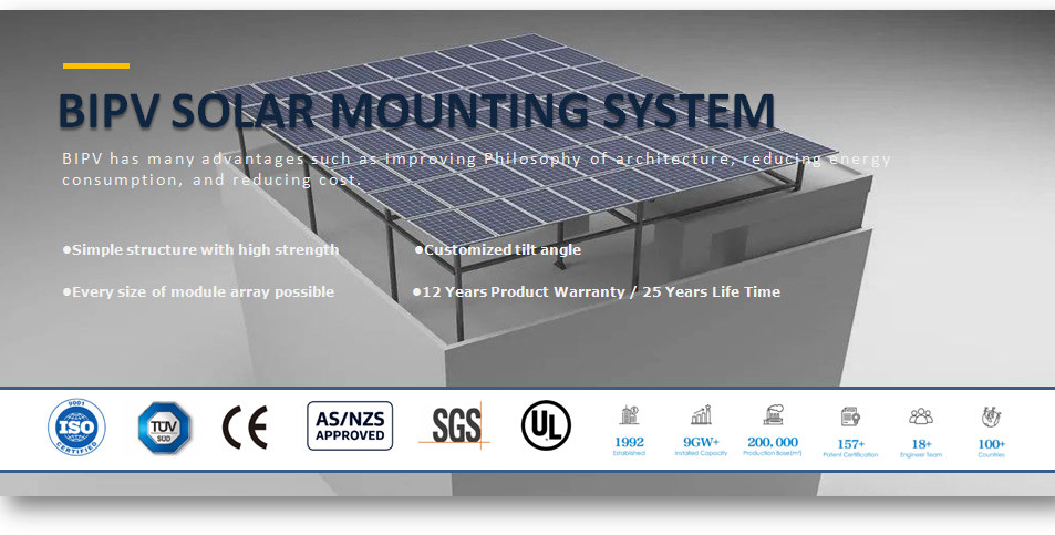BIPV Solar mounting system is typically applied on flat open field ground or Rooftop. The mounted solar structure with concrete base is easy to build. It is much easier to install. Main components of solar mount racking are high pre-assembled in our factory, which save lots of your on site installing time and cost. Components are full sides anodized even for small parts, which has a great anti-corrosion effect and long lifetime.