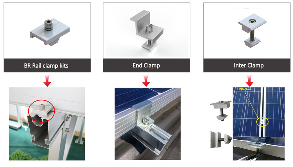 This clamp for fix rails . Main material is AL6005-T5 with average 12μm anodizing film. Unique design of Mid & End clamps are used in different types of solar panels. Special design of rail can make intallation simpler and faster. Parts have been high pre-assembly on factory to save your installation time.