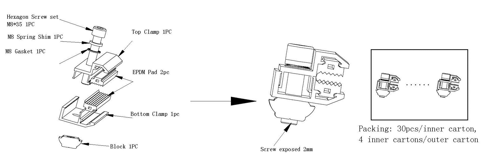 The Thin Film End Clamp for Solar Panel is made of aluminum AL6005-T5, combined with EPDM pads, tightly fasten the frameless panel on rails. It is workable for the thin film panels with thickness 6-10mm. Pre-assembled in factory which save your on site installing time and cost.