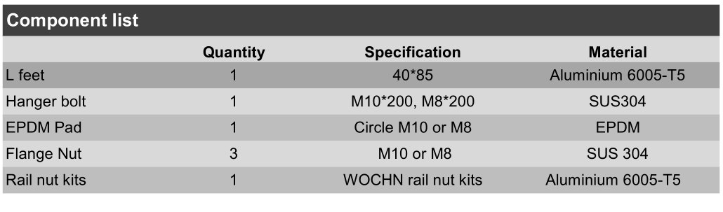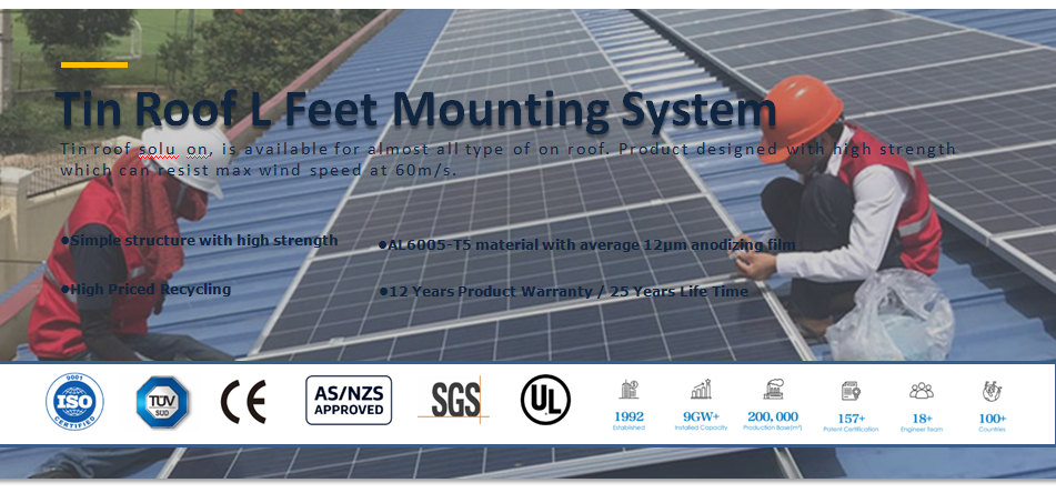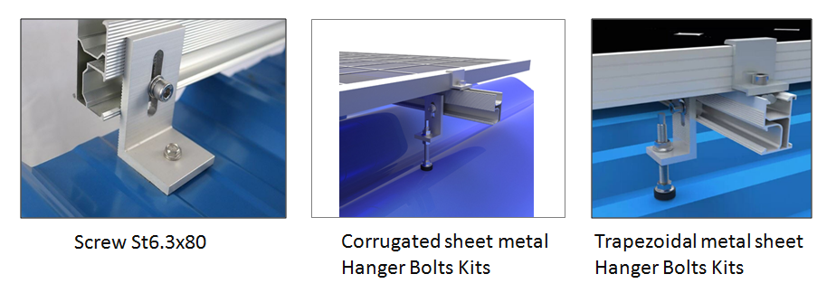 L feet brackets mainly applied to trapezoidal metal sheet roofs and corrugated metal sheet. It can be directly fixed on the roof beam with screw. Hanger bolt and Screw St6.3x80 apply to install on steel beam and Wooden beam. Making installation faster, competitive and reliable. Systems are fully compliant with international standards on wind & snow load.