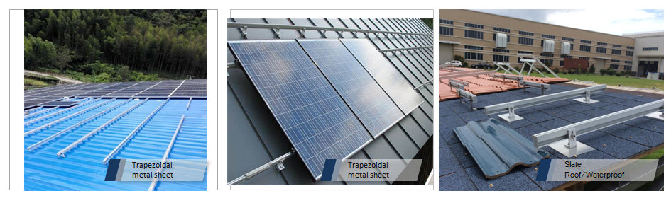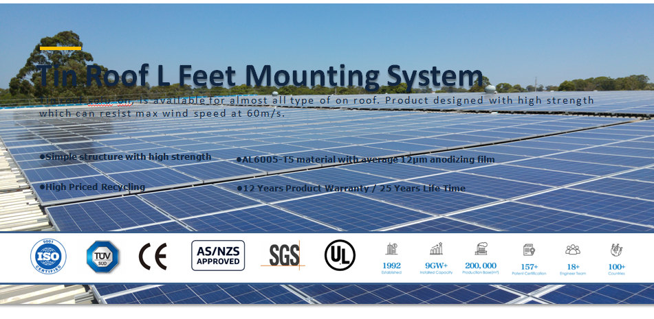 The metal roof mounting system is suitable for roofing with corrugated sheet metal, trapezoidal metal sheet. L Feet .Tin roof solution, is available for almost all type of tin roof. Product designed with high strength which can resist max wind speed at 60m/s. Main material is AL6005-T5 with average 12μm anodizing film. Fasteners are stainless steel material which featured with high strength and high anti-corrosion.