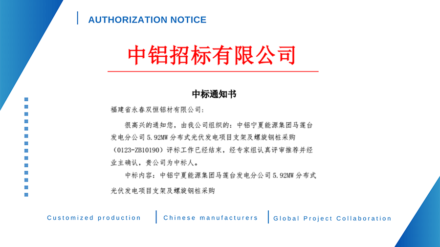 It is very honor to received the letter of bid Authorization Notice Letter of solar ground brackets and ground screws for the 5.92MW solar power generation project from China Aluminum Ningxia Energy Group's Maliantai Power Generation Branch. Thank you to China Aluminum Ningxia Energy trust and support.