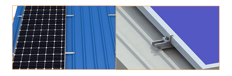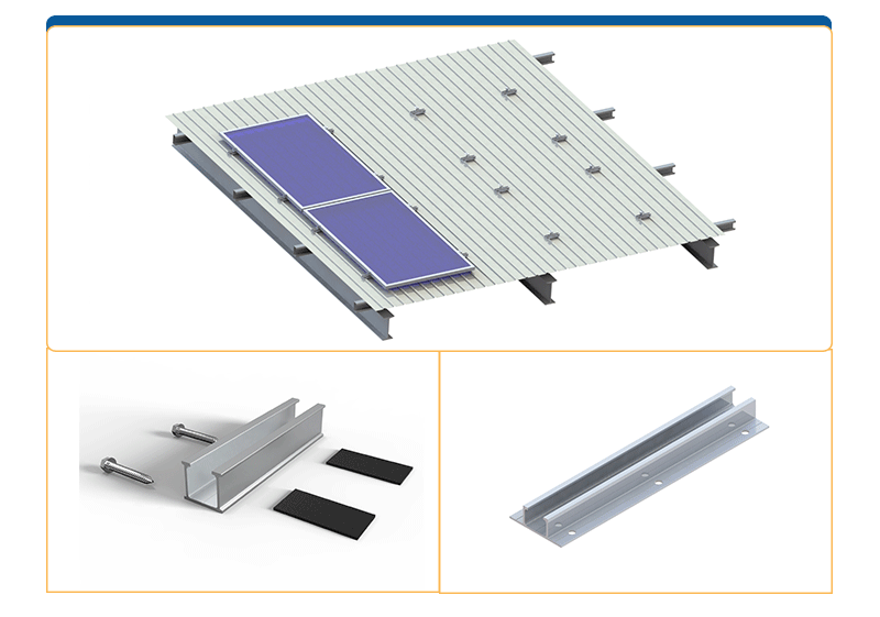 Lightweight rails can be installed on metal roofs, The U-shaped structure is a combination of guide rails and clamp. low cost and quick installation. Riveted or screwed onto raised corrugations.
